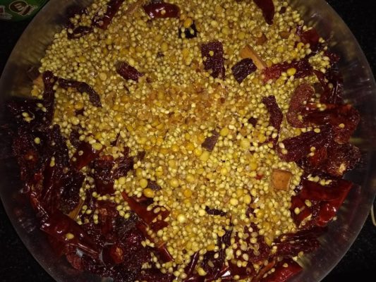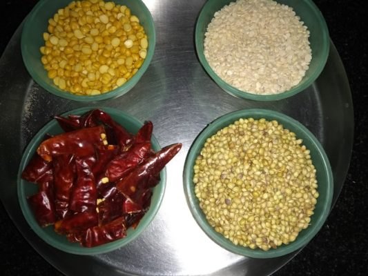 - Clean coriander seeds, gram dal, and urad dal. Cut the red chilies into small pieces.