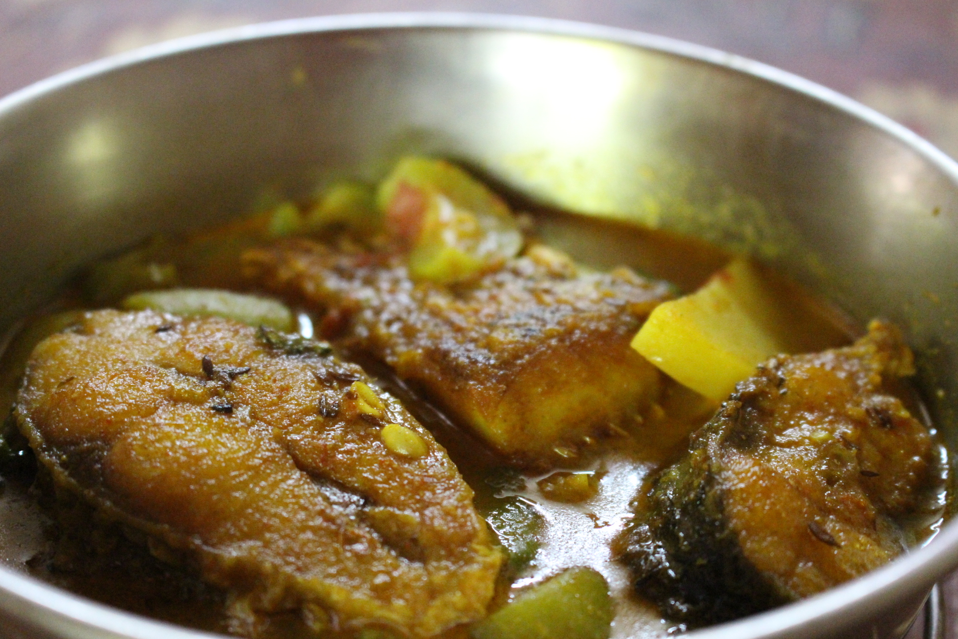 Keep the skillet on the gas and heat the oil well, simmer the gas (as it has a tendency to spurt) and put in 2 pieces of fish and fry well on high flame till slightly golden on both sides. Put aside on tissue paper for the oil to soak. Repeat the same till all fish pieces are fried. Add the paste in the remaining oil along with tomatoes and fry well till the paste leaves oil at the sides. Then add coriander, cumin and chili powder, a pinch of sugar and salt to taste. Add the potatoes and 2 cups of water. Keep to boil and cover till potatoes are cooked. Add one cup of water, boil and put the fried fish pieces into it. Cover and Simmer on slow fire for 5 min. Serve with steaming plain rice…