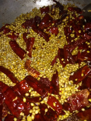 - Now add coriander seeds, chilies and fry for 10 minutes on low flame only with continuous stirring. It gives out a nice aroma that you can feel in the entire house.