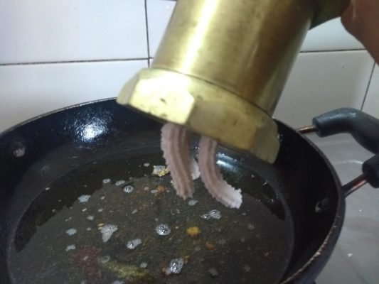 Heat the oil in a pan and put the chakli’s when the oil is hot. Deep fry on a slow flame till it turns golden brown. Do not raise the flame to cook it fast. It should be fried in low flame only. I directly squeeze the calculus into oil, but if you are a novice, you can first make them on a plastic sheet and then transfer to oil.