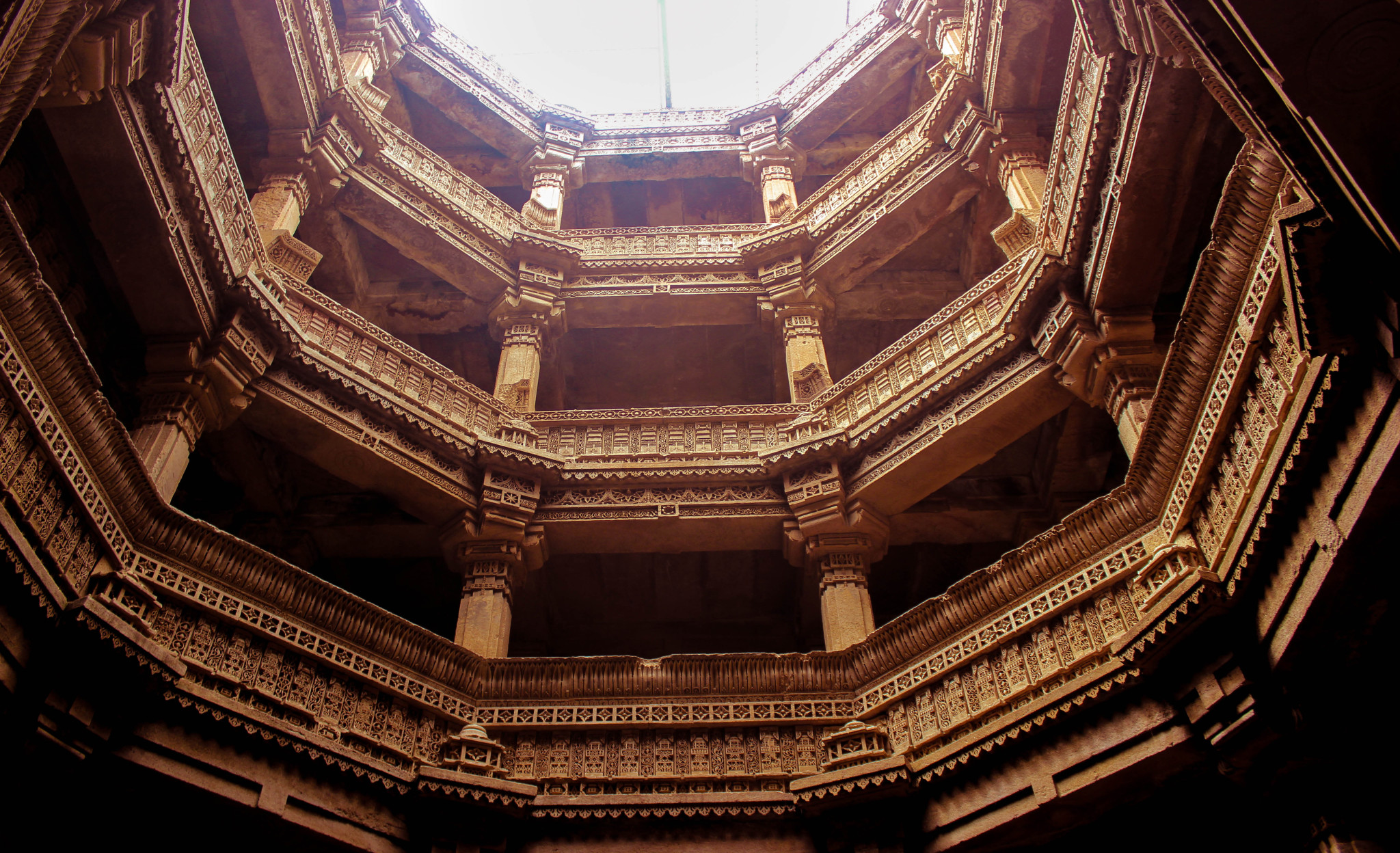 Adalaj Vav located in Adalaj village near Ahmedabad in Gujarat is one of the most popular tourist attractions of Ahmedabad. It is a five-storey octagonal stepwell with Solanki architectural style and having intricate carvings. A Sanskrit inscription on a marble slab in the well reveals the tragic story behind the construction of the stepwell. Construction was started by Rana Veer Singh of Vaghela Dynasty in 1498, but he was killed by the Muslim invader Mohammed Begada. In 1499 Begada completed the construction of the stepwell to please the widow Queen Roopba, hoping that he could marry her. But on completion of the well, the queen threw herself into the well, making it a tragic history. This 75 feet deep baoli with Indo-Islamic architecture has a large number of intricately carved pillars with carvings of legendary scenes, elephants, musicians, dancers and women involved in daily activities. There is a blend of Islamic floral patterns and symbolism of Hindu gods carved at different floors.