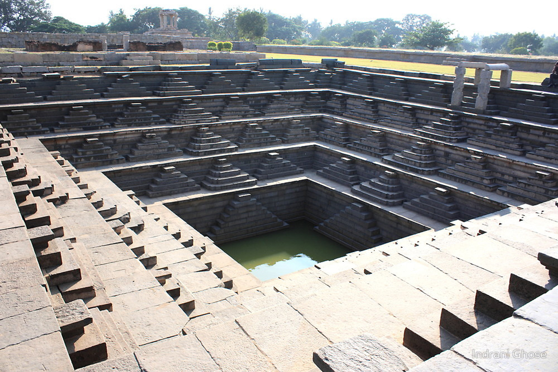 Pushkarni, the 15th century stepwell of the Vijayanagara Kingdom, was discovered near the King’s pavilion, amidst the ruins of Hampi, in an archaeological excavation held in 1980. The square shaped baoli has five stages with diminishing dimensions towards the bottom and precise cuts of steps that add beauty to this marvelous structure. Inscriptions indicate that prefabricated construction techniques were employed to finish the work faster. Water was supplied from inland through a masonry canal system which is still in perfect condition. The influence of Chalukya architecture is clearly reflected in the design and construction of the stepwell. Between the stepwell and the Kings Pavilion, there is an underground chamber which was a venue for the royal meeting of the King.