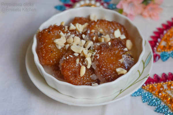 - Heat ghee in a high flame first, then reduce the flame to medium. Make dumplings out of the fermented batter and fry gently. I used two spoons to make dumplings and gently scooped it in ghee. Once the dumplings get light brown in color on both sides, place it in paper towels to remove excess oil and then dip them in the warm sugar syrup. Let it dip till it is nicely soaked in sugar syrup.