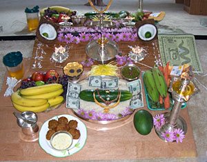 On the Puthandu eve, a tray with three fruits banana, mango, and jack-fruit is arranged. The tray is filled with silver and gold jewelry, betel leaves, areca nuts, money, mirror, and flowers. Some also fill it with vegetables and lots more. This tray is viewed soon after waking up, early in the morning. People get up from the bed and with eyes closed come near the tray or are escorted by early risers to the tray and they open their eyes viewing this full tray known as ‘Kanni’. This is followed by bathing and pooja. Sweet pongal, which is the special recipe of the day is offered to God.