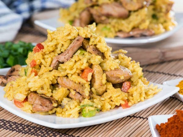 The preparation of this Indian rice recipe is a lot similar to that of birayani; it starts with the sauté of chopped onions, black pepper, and turmeric and ginger paste. Tip of bay leaves are then burnt and dropped in the pan along with pork which is fried until light brown. Washed jadoh rice is then added to it along with salt and water to cook. The well cooked dish is then garnished with cilantro.